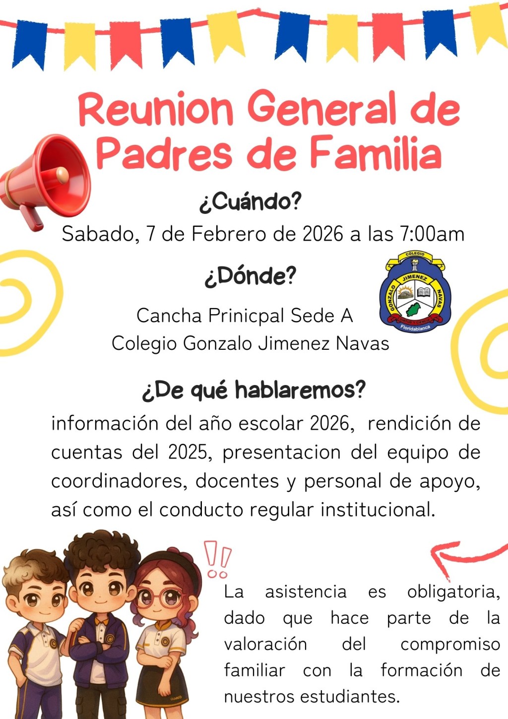 La institución educativa les convoca a la Reunión General de Padres de Familia, espacio en el que se presentará la información del año escolar 2026, la rendición de cuentas del 2025, el equipo de coordinadores, docentes y personal de apoyo, así como el conducto regular institucional.